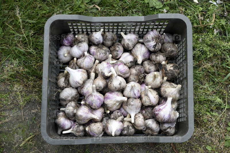 чеснок в пластиковой корзине. урожай чеснока осенью. седые луковицы