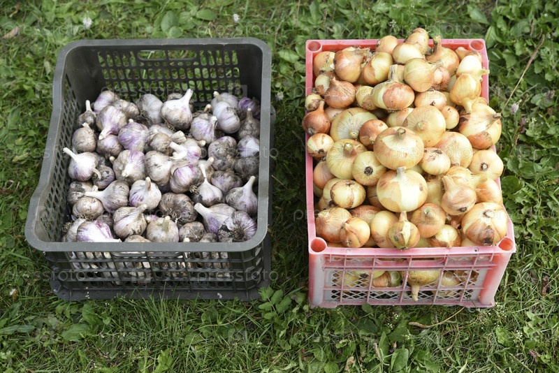 Корзины с луком и чесноком. Свежие луки и чеснок. Лук и чеснок для продажи в корзине