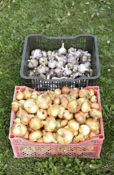 Корзины с луком и чесноком. Свежие луки и чеснок. Лук и чеснок для продажи в корзине