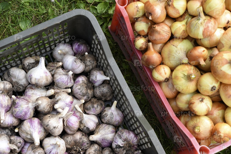 Корзины с луком и чесноком. Свежие луки и чеснок. Лук и чеснок для продажи в корзине