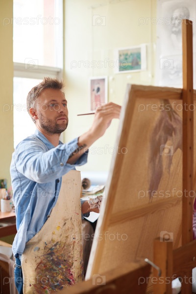 Художник в окрашенном фартуке стоит перед эстафетой и рисует