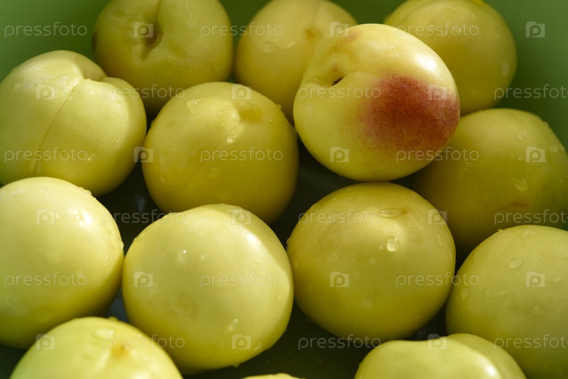 Зрелая слива в зеленом бассейне сочный фрукт зрелые сливы в капельках воды