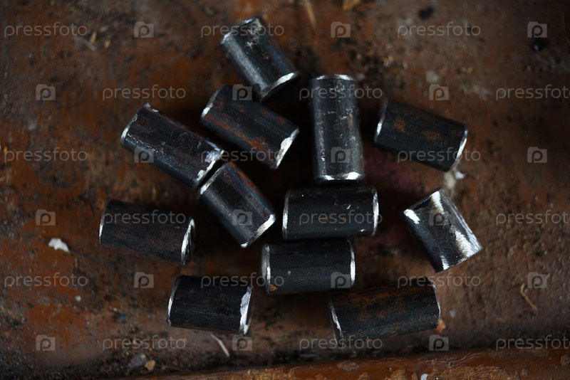 Металлические стержни.Разрежьте металлическую фитингу.Металловые кусочки на заднем плане