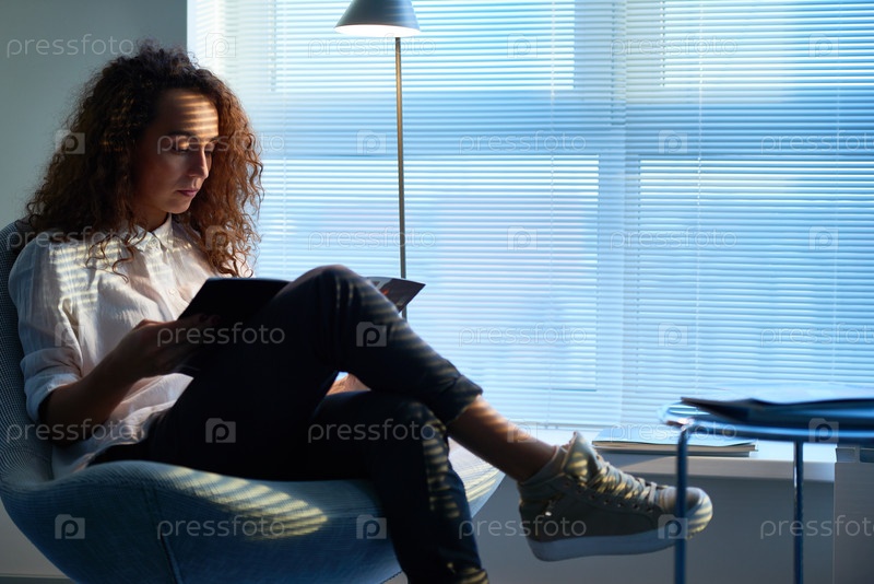Молодая стилистка в поисках новых идей читает журнал моды