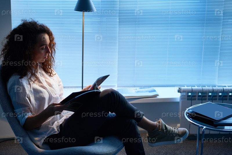 Женщина-журналист с длинными кудрявыми волосами сидит в мягком кресле