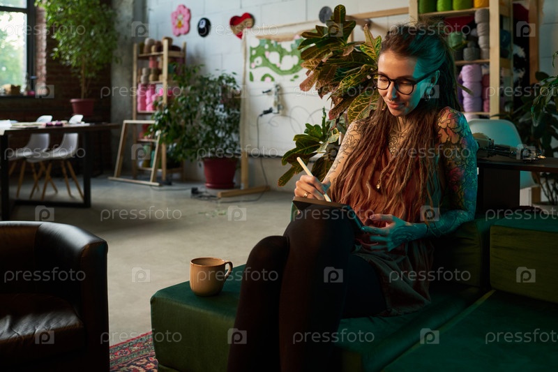 Молодая взрослая женщина рисует концепцию ковра на цифровом планшете в мастерской