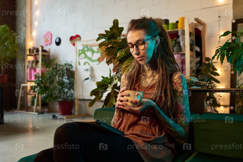 Молодая женщина отдыхает с кофе, работая в ковровой мастерской