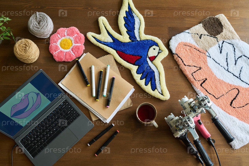 Молодых взрослых, создающих красочные туфтовые ковры в мастерской ручной работы