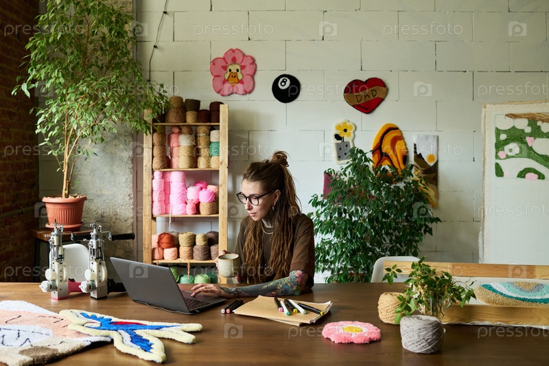 Молодая женщина работает на ноутбуке в ковровой мастерской, окруженной пряжей