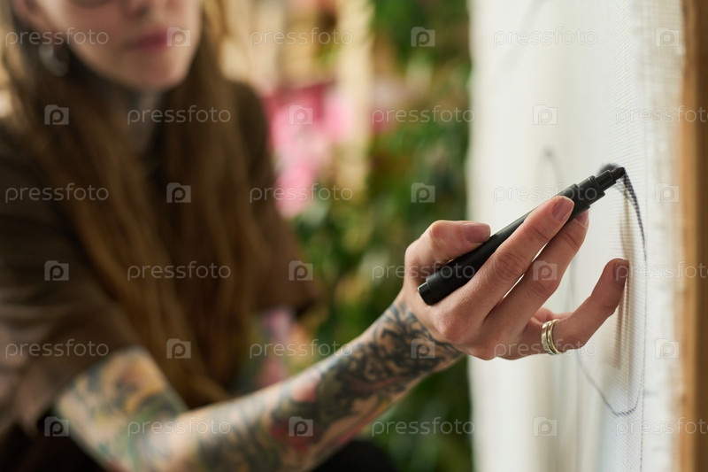 Молодая взрослая женщина рисует узоры на холсте в мастерской ковров