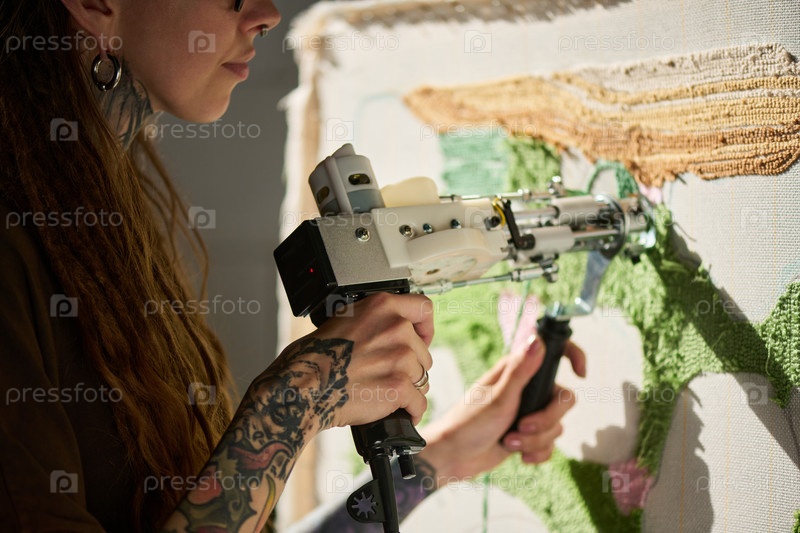 Молодая взрослая женщина использует туфтовое оружие, делая художественные работы на ковре