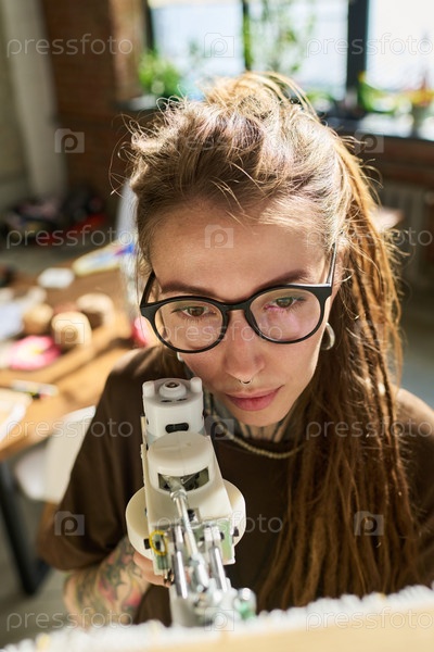 Портрет молодой взрослой женщины, использующей туфтовое оружие в ковровой мастерской