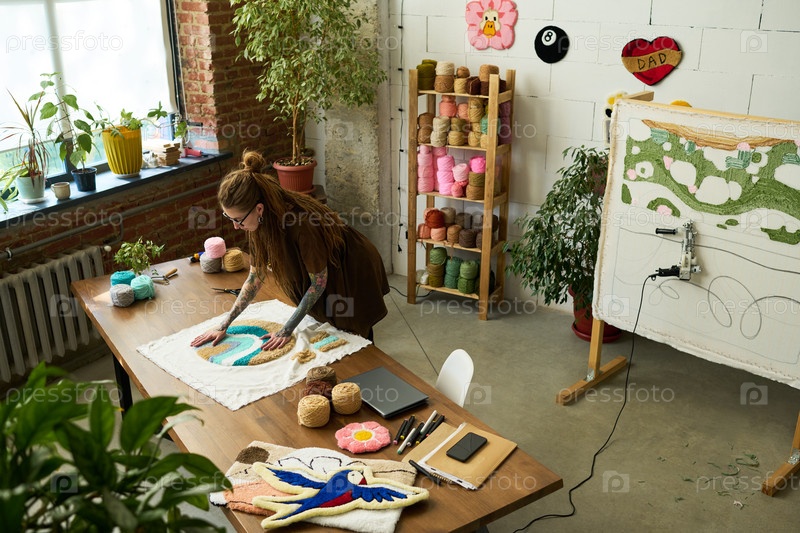 Молодая женщина создает дизайн ковра ручной работы в мастерской ремесленников