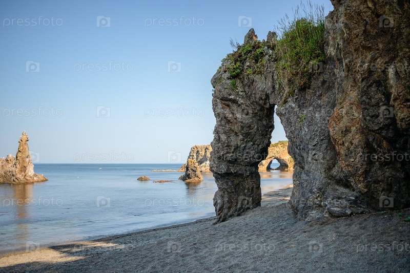 Образование естественной каменной арки на мысе Птицы с захватывающим видом на океан под чистым голубым небом. идеально подходит для приключений и концепций природы