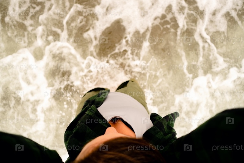 Сверху вниз фотографии женских ног, наслаждающихся океанскими волнами и пеной на идеальном песчаном пляже