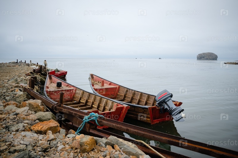 Традиционные рыбацкие лодки, выходящие из утреннего тумана на Сахалине. идеально подходит для морского образа жизни и прибрежных приключений