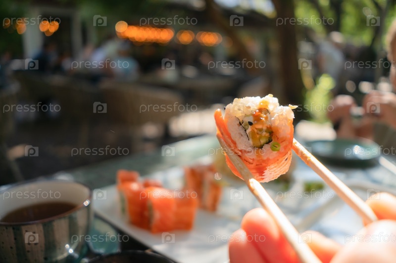 Свежий лосось и огурцовый рулон суши с палочками, красиво представленный подлинной японской кухней на заднем плане