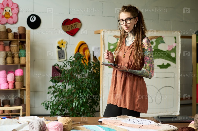 Молодая взрослая женщина разрабатывает узоры ковров в творческой мастерской