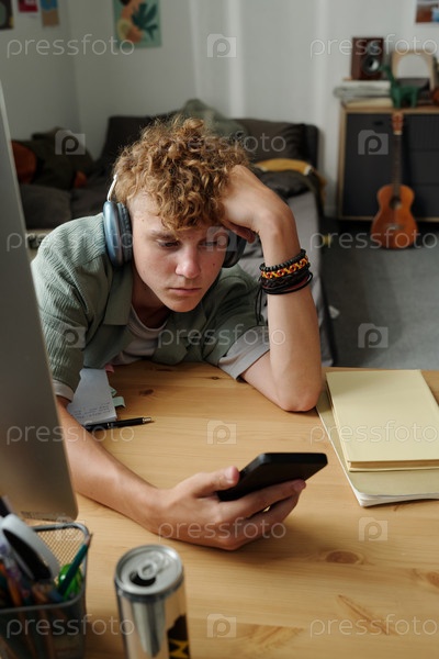 Мальчик-подросток носит наушники с помощью смартфона, сидя в помещении