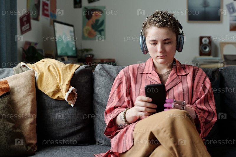 Молодая взрослая женщина, использующая смартфон и наушники, испытывает гаджетовую зависимость