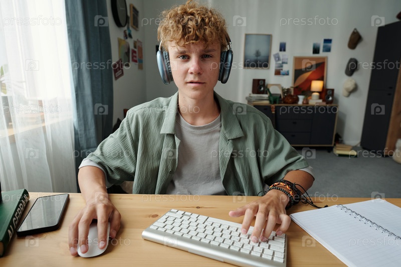 Портрет мальчика-подростка, использующего компьютер и наушники в помещении