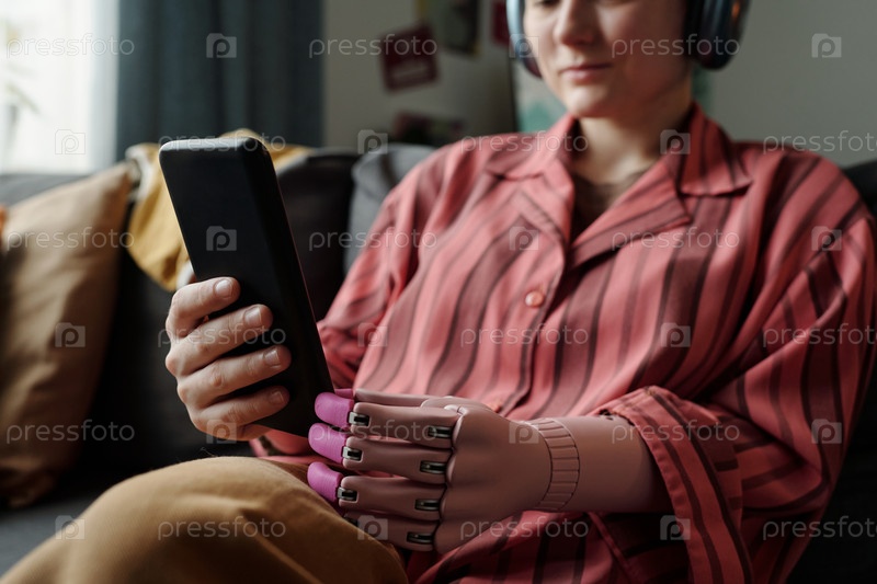 Молодая взрослая женщина с протезированной рукой занимается смартфонным устройством