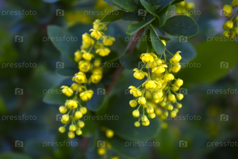Желтые цветы обычной берёзы (Berberis vulgaris), на зеленом кусте