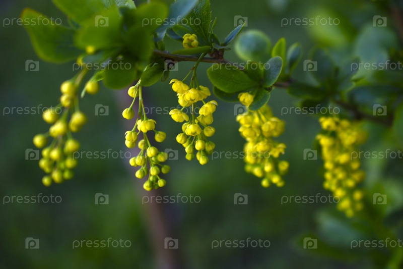 Желтые цветы обычной берёзы (Berberis vulgaris), на зеленом кусте