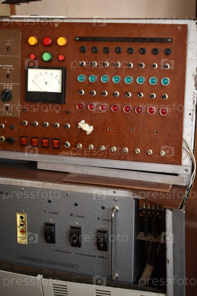 Старая панель управления с вольтметром, выключателями и лампами. Электронная панель управления с кнопками и переключателями. Старые системы управления