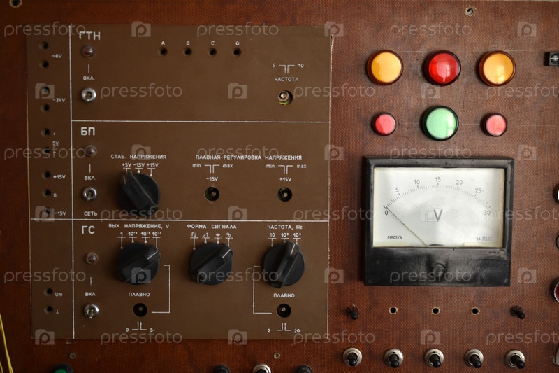 Старая панель управления с вольтметром, выключателями и лампами. Электронная панель управления с кнопками и переключателями. Старые системы управления