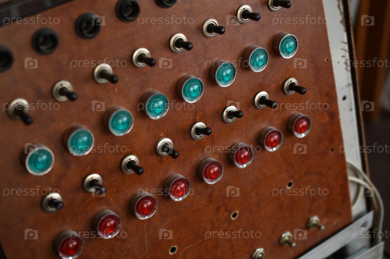 Старая панель управления с вольтметром, выключателями и лампами. Электронная панель управления с кнопками и переключателями. Старые системы управления