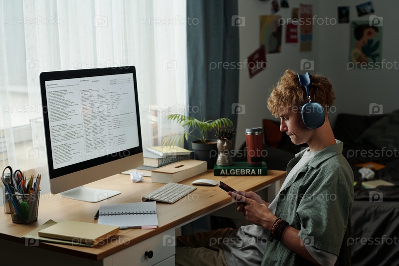 Мальчик-подросток сидит за рабочим столом, использует смартфон и игнорирует компьютерный экран