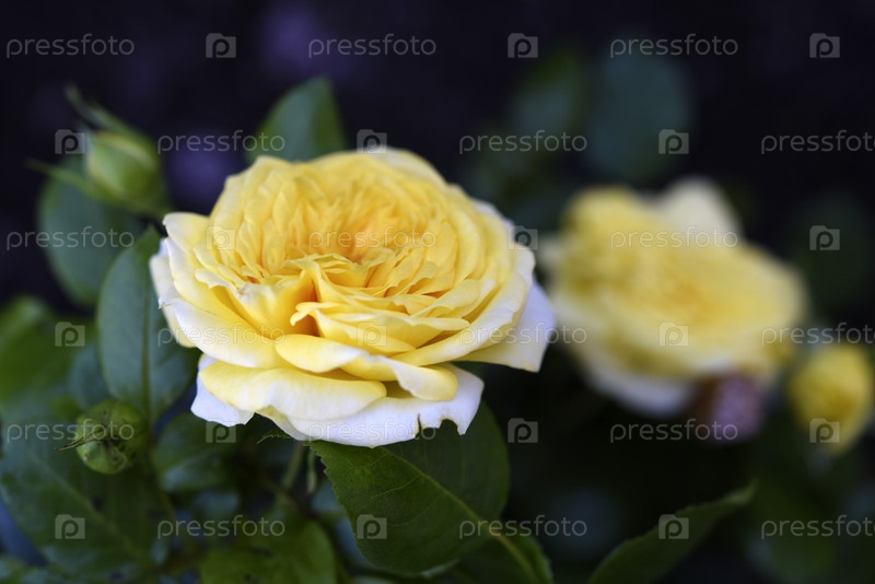 Куст с желтыми розами. Желто-розовый бутон. Сочные жёлтые цветы