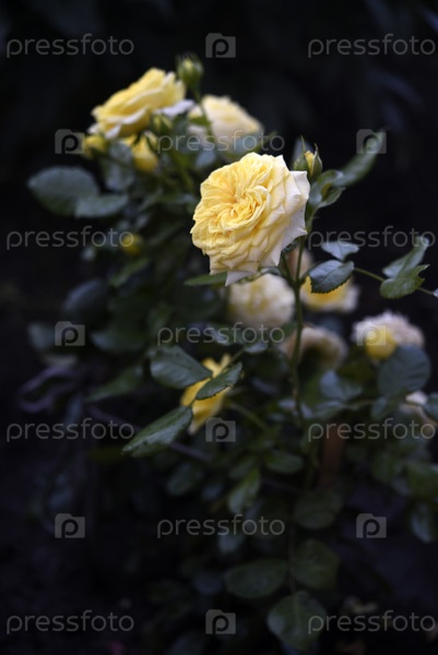 Куст с желтыми розами. Желто-розовый бутон. Сочные жёлтые цветы