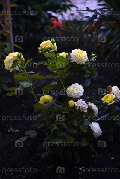 Куст с желтыми розами. Желто-розовый бутон. Сочные жёлтые цветы