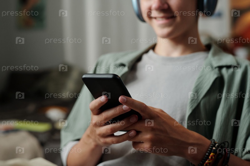 Мальчик-подросток использует смартфон, нося наушники в помещении