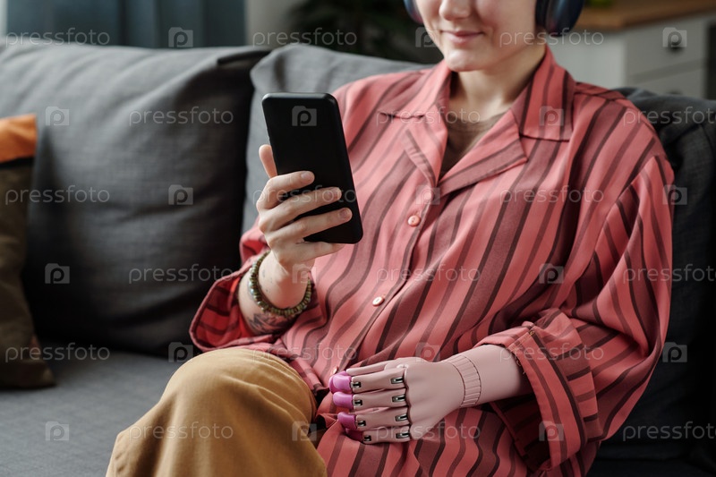 Молодая взрослая женщина с протезированной рукой, использующая смартфон на диване