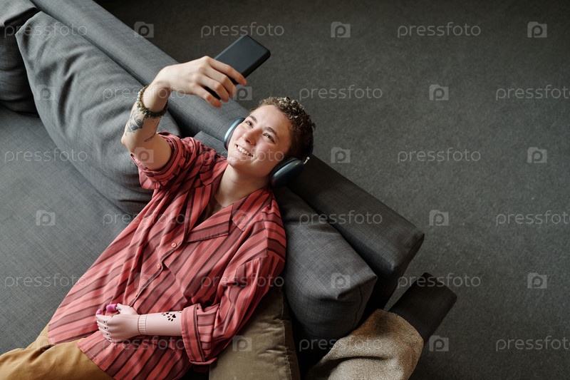 Молодая взрослая женщина с протезированной рукой, использующая смартфон на диване