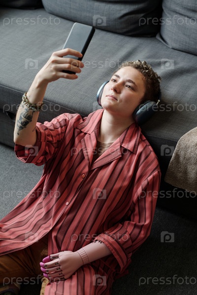 Молодая взрослая женщина с протезированной рукой использует смартфон во время отдыха