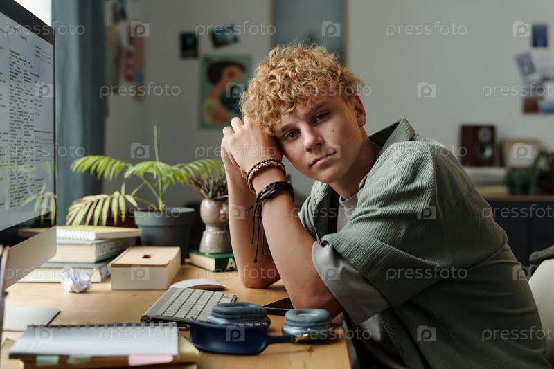 Портрет мальчика-подростка, сидящего за рабочим столом с помощью компьютера и выглядящего усталым