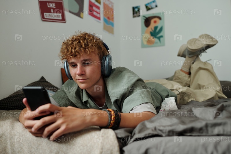 Мальчик-подросток лежит на кровати, пользуясь смартфоном и слушая музыку