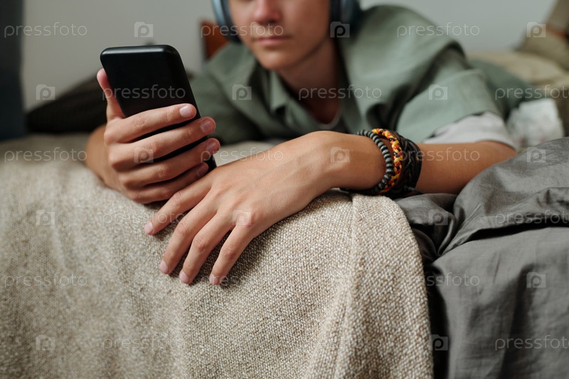 Мальчик-подросток лежит на кровати, используя смартфон и носящий наушники