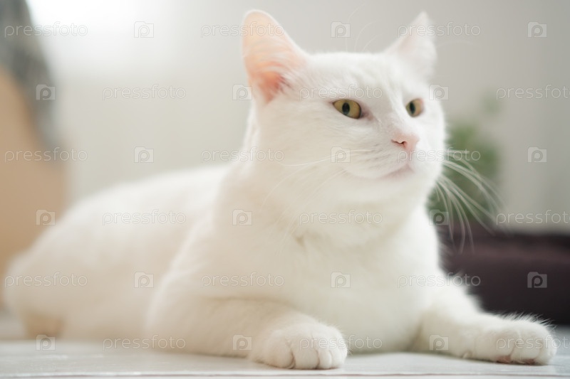Плодородная белая кошка наслаждается нежными прикосновениями от человеческой руки, мирно мурлыкает.Портрет Кошки Счастье и Связь между Человеком и Животным