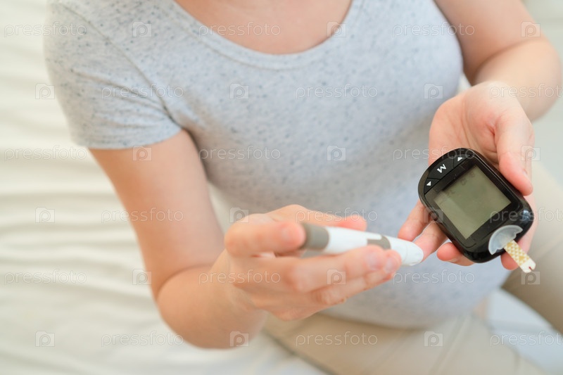 Будущая мать выполняет важный тест на глюкозу во время беременности. завершая анализ пальца крови для скрининга и профилактики диабета. вид сверху