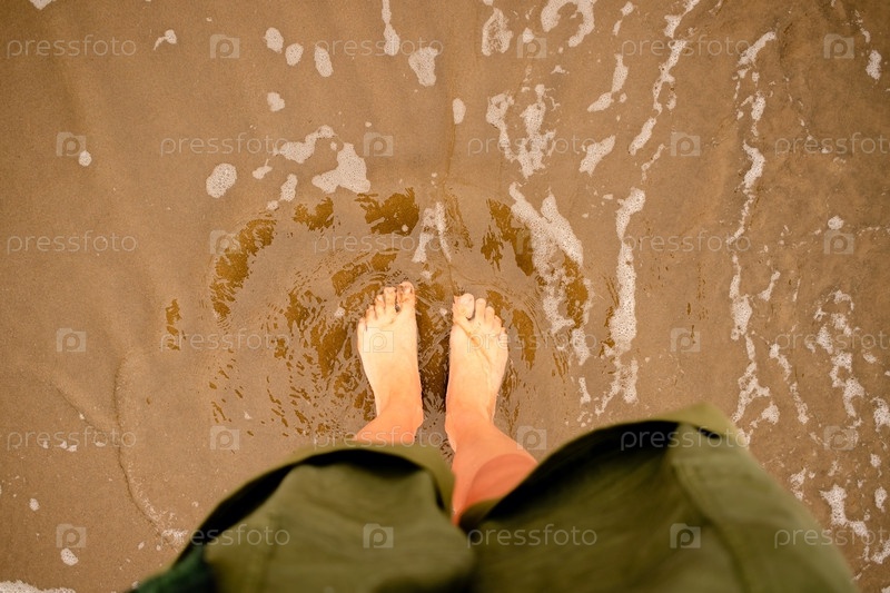 Женские ноги в океанских волнах на песчаном пляже - Aerial View