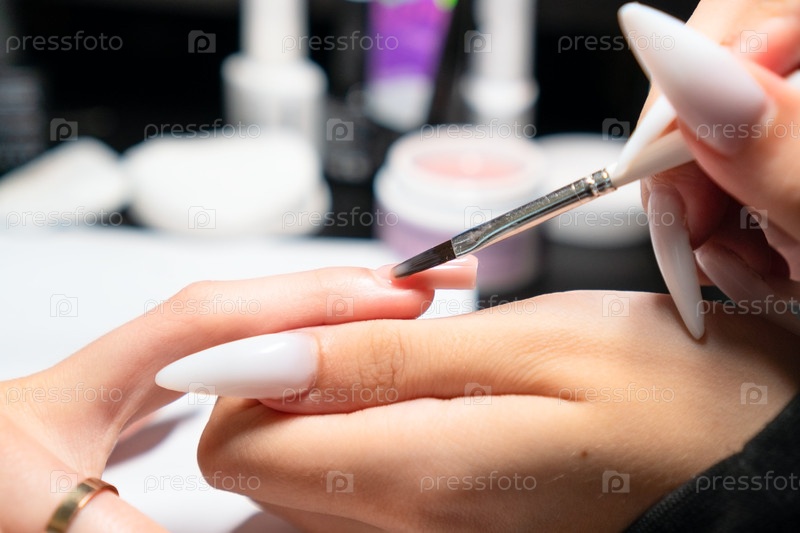 Техник по ногтям умело наносит и равномерно распределяет гелевой лак во время службы обновления для безупречных результатов маникюра