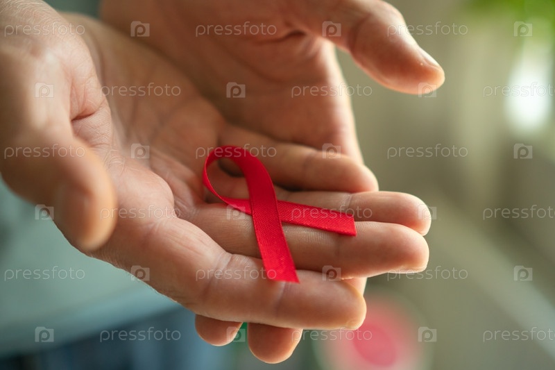 Молодой человек держит красную ленту для повышения осведомленности о СПИДе
