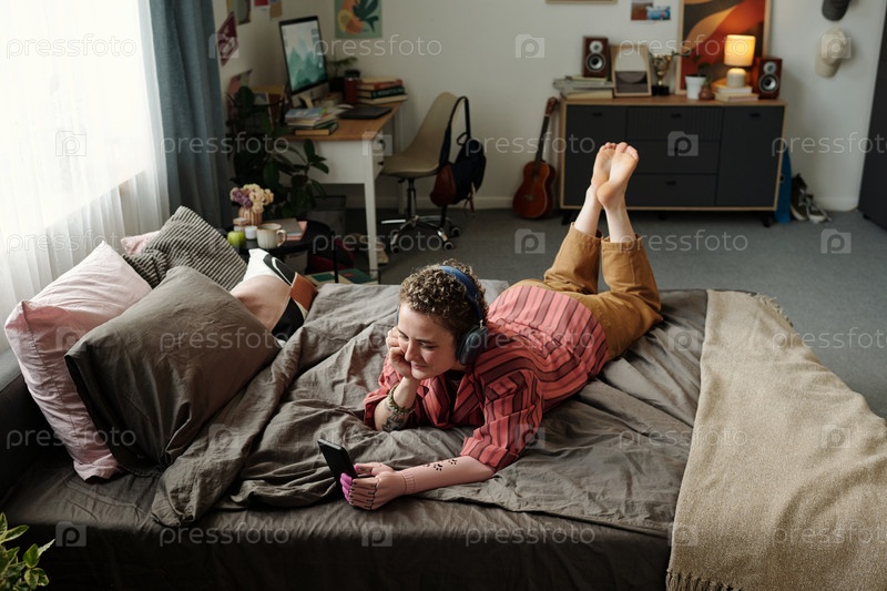 Молодая женщина, лежащая на кровати с помощью смартфона и носящей наушники