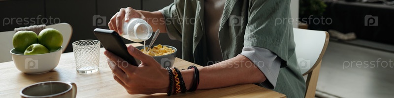 Молодой взрослый мужчина использует смартфон, наливая молоко в блюдо с хлопьями