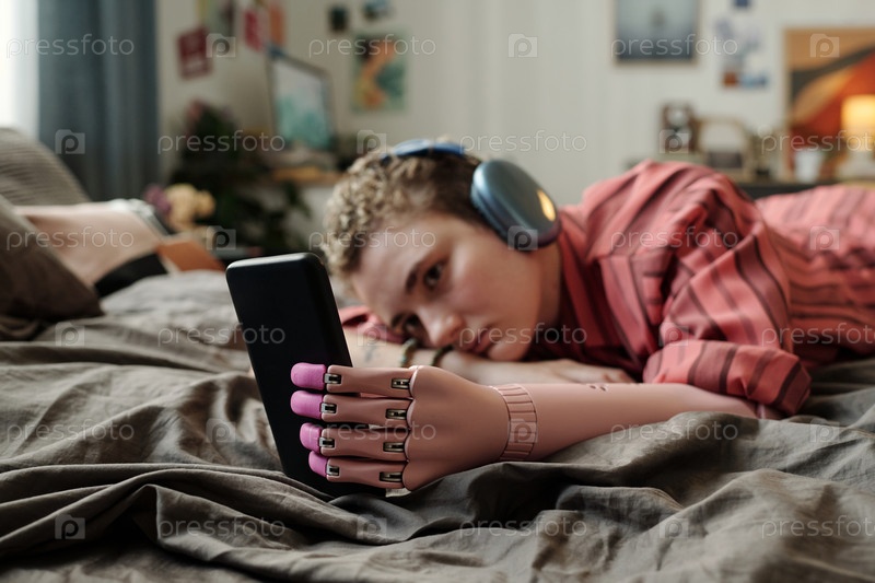 Молодая женщина с протезированной рукой лежит на кровати, используя смартфон